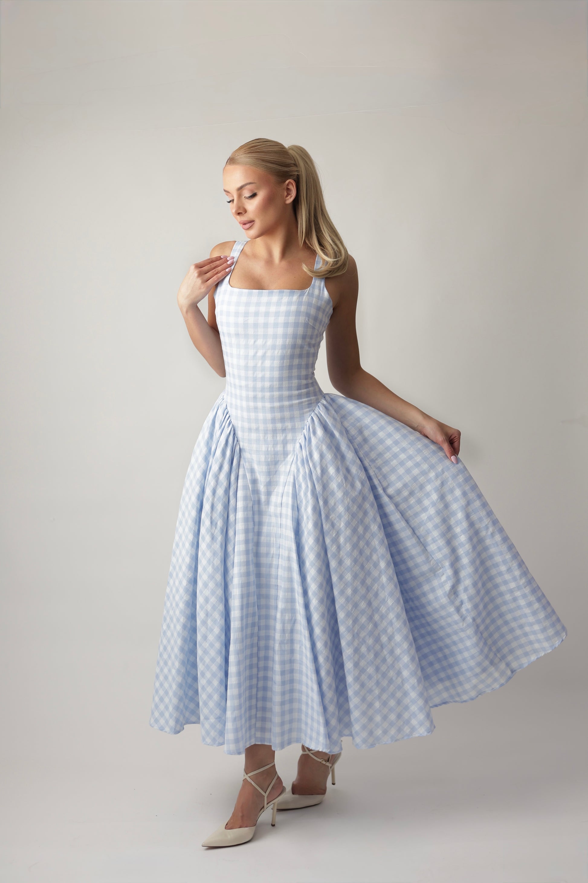 Romantična midi haljina u plavoj gingham nijansi, dizajnirana da naglasi siluetu i donese lakoću svakom koraku.